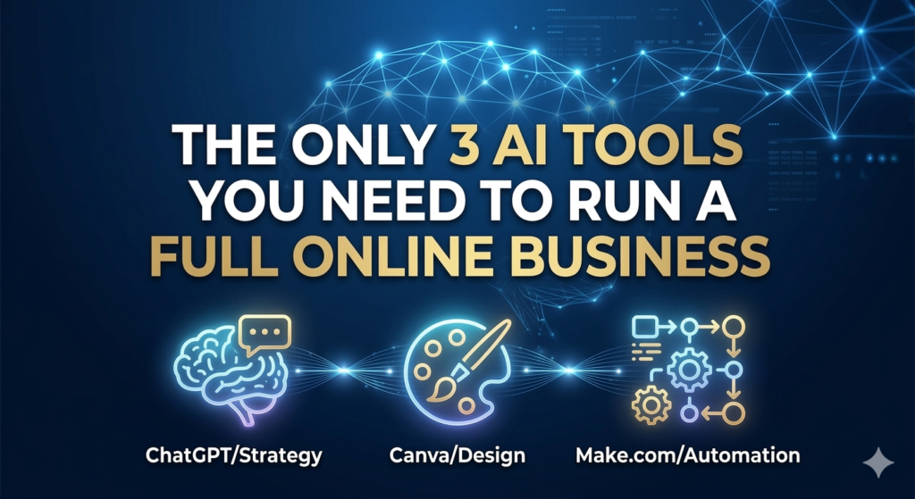 Master the only 3 AI tools you need to run a full online business. Discover how to use ChatGPT, Canva, and Make.com to build, design, and automate your digital empire with zero stress.